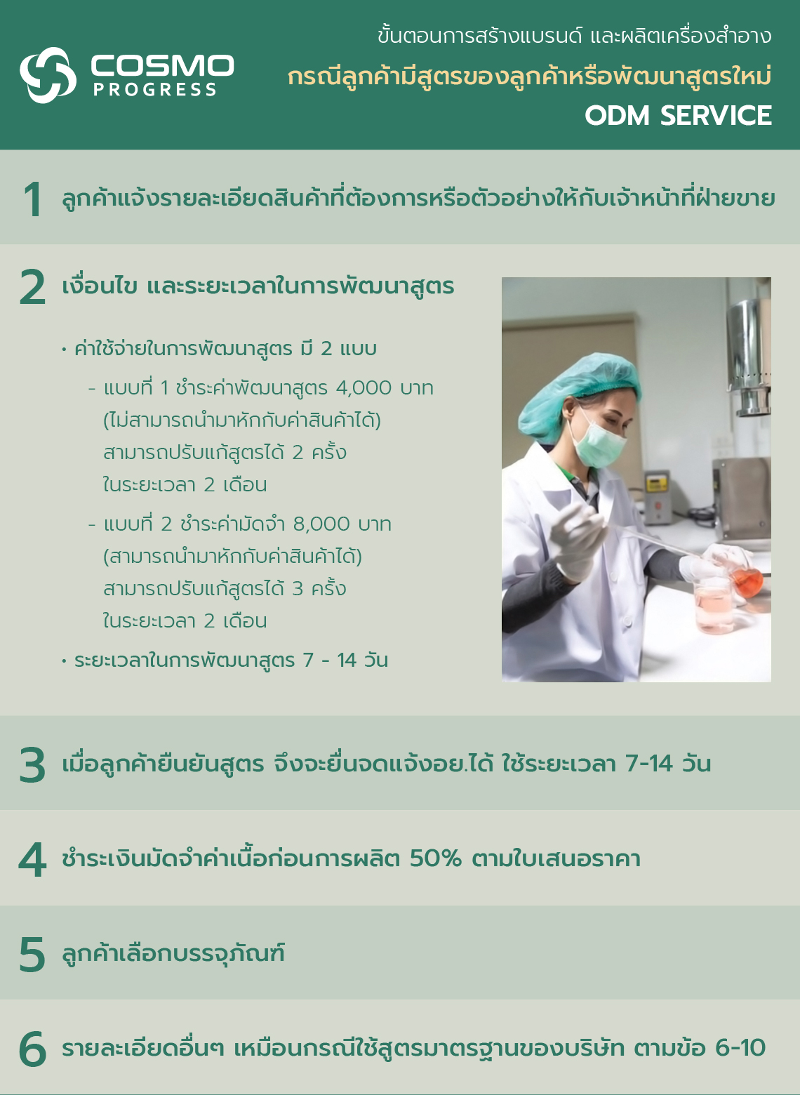 คิดค้น วิจัยพัฒนาสูตร ตามความต้องการของลูกค้า มีห้องปฏิบัติการสำหรับ วิเคราะห์คุณภาพของผลิตภัณฑ์ บริการทดสอบความคง ตัวของเนื้อครีม ตรวจสอบ และควบคุมคุณภาพ เราใส่ใจในทุกขั้นตอนตั้งแต่คุณภาพของ วัตถุดิบ คัดสรรสกัดใหม่ๆ ที่มีคุณภาพ และหลากหลาย รวมถึงให้คำปรึกษา วางแผนการตลาด ออกแบบสินค้า เลือกสิ่งที่ดีที่สุดเพื่อคู่ค้านำไปต่อยอด ธุรกิจจนประสบความสำเร็จ